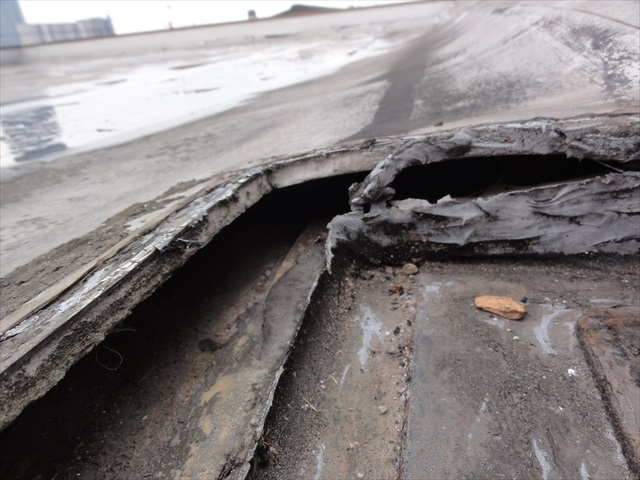 現況はシート防水なのですが、経年による劣化、収縮、めくれ等の傷んだ箇所が多々ありました。