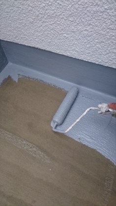 正面周囲外壁(仕上塗“ツヤ有クリア”2回塗)・ベランダ土間防水(中塗~仕上)の工程です。