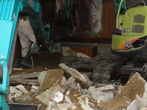 3_重機2車で、土間やコンクリート箇所を割って解体します。