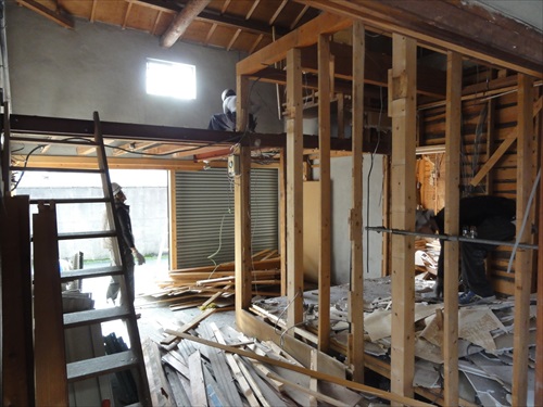 躯体(骨組)を残し、内装を全て解体します。重機を入れるのは土間コンクリートを斫って解体する時だけで、他は全て手バラシです。解体工事の工期は6日間の予定です。。。いよいよO様邸改修工事が本格的に始まりました♪