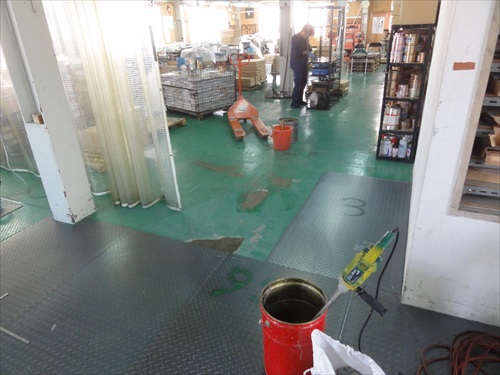 お得意先のS社様から工事受注頂戴しました。工場内を重い荷物積んだリフトで作業されるので、土間コンクリートが傷み、穴が掘れた状態になった箇所があるので補強修理をして欲しい、とのご依頼でした。