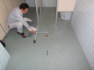 地べたにカバンを置いて現場調査できるほど清掃の行き届いた綺麗なY社様のトイレなのですが、男女兼用トイレになっており、「(トイレ内で)男女別に分かれるように間仕切って欲しい。」とのご依頼を頂戴致しました。