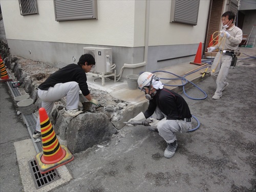 本日より、外構エクステリア工事(正面・玄関周囲)着工しました。斫り屋が現場入りし、コンプレッサーでどんどんコンクリートを割り、撤去していきます。