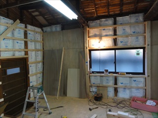 筋交を入れ、構造を補強し、土壁の無い壁には断熱グラスウール入れ、